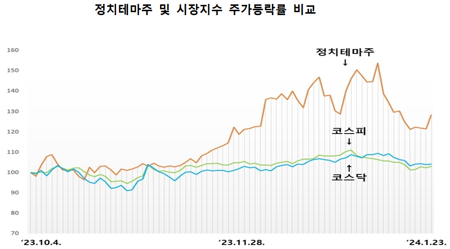 정치테마주는 기업의 실적과 무관하게 주가 이상 급등이 발생하고, 정치인의 학연·지연 등 단순 인적관계에 기반하거나 합리적 근거 없이 테마주로 분류되는 경우가 많아 투자 위험성이 높다.