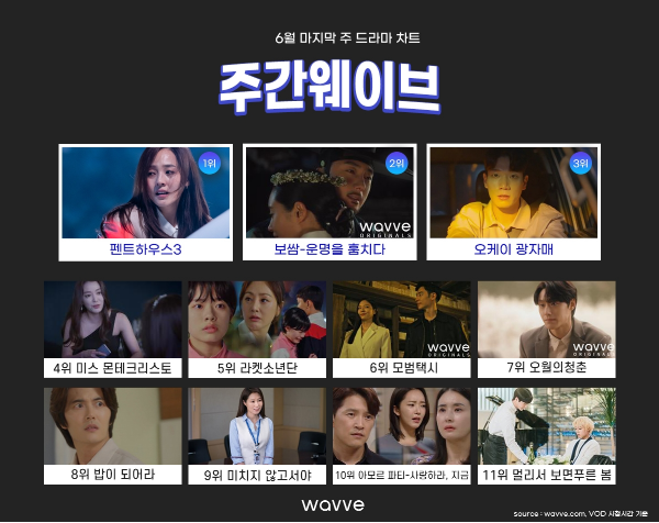 웨이브 드라마 차트 상위권을 줄곧 유지하고 있는 ‘펜트하우스 시즌 3’과 ‘보쌈’는 전주에 이어 시청 시간을 소폭 상승하며 순위를 이어 나갔다.
