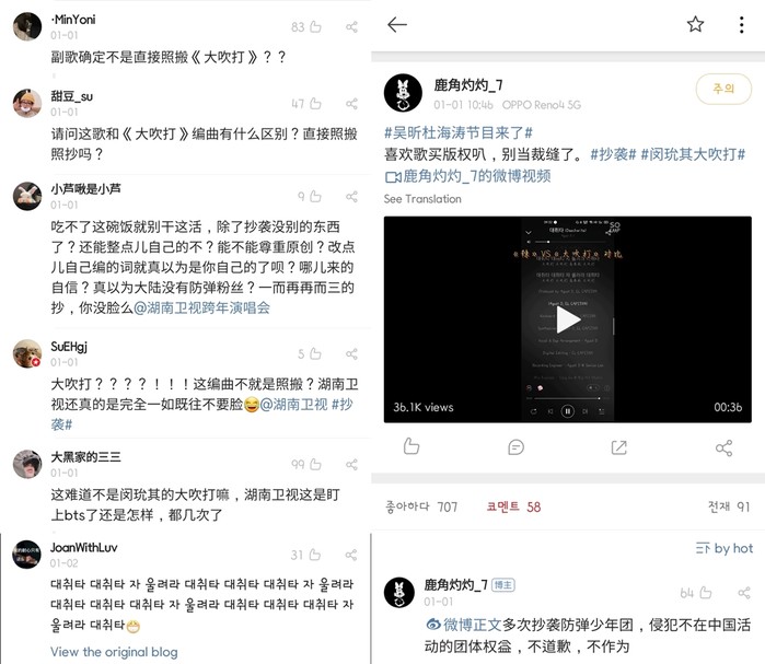 이어 다른 네티즌은 "이 노래와 대취타 편곡과 무슨 다른 점이 있나? 직접 모방모사인가?" "대취타 이 편곡은 모방이 아닌가? 후난위성은 정말 뻔뻔하다" "민윤기의 대취타가 아닌가. 후난위성은 BTS를 욕심내는거 아니면 뭐냐. 벌써 여러 번이다" "표절 말고 다른 것은 없나. 창작을 존중할 수는 있나? 진짜 대륙에 방탄소년단 팬이 없는 줄 알았나" 등 표절이 아니냐고 의문을 제기했다.