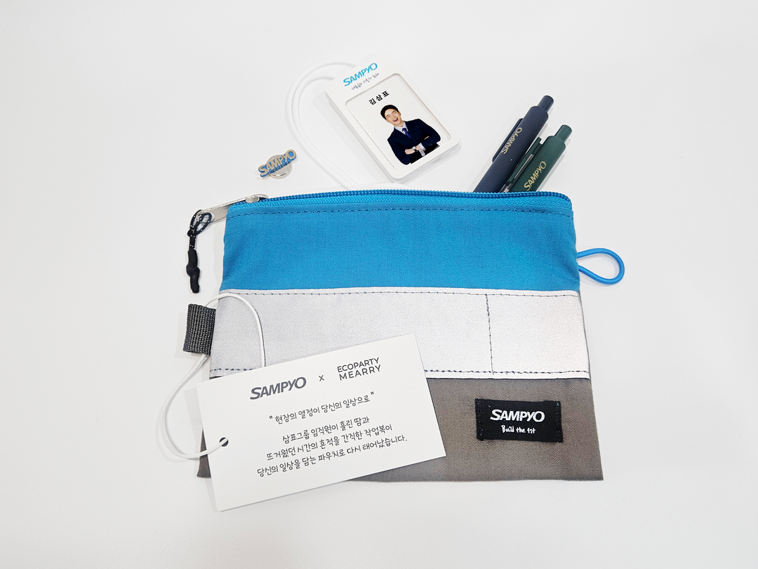 8일 삼표그룹에 따르면, 국내 최초 업사이클링 브랜드 ‘에코파티메아리’와 협업한 삼표그룹은 낡은 작업복을 파우치로 재탄생시켰다.