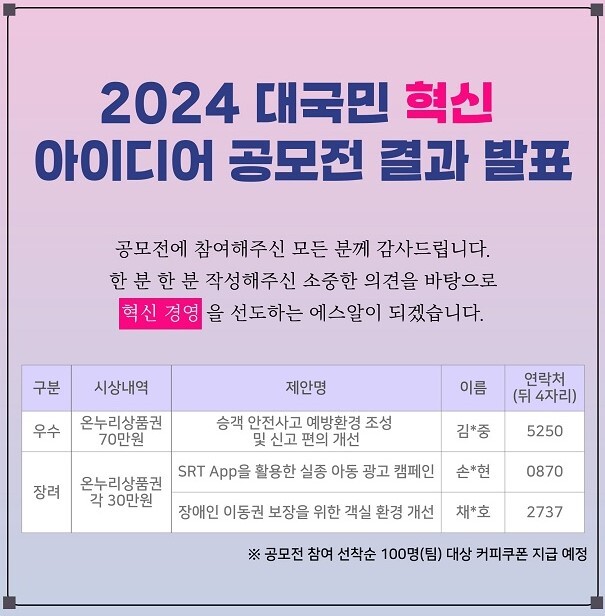 이종국 에스알 대표이사는 “대국민 공모전을 통해 발굴된 제안들이 에스알의 혁신과 고객서비스 발전을 이끄는데 귀중한 자원이 되길 기대한다”라고 말했다.