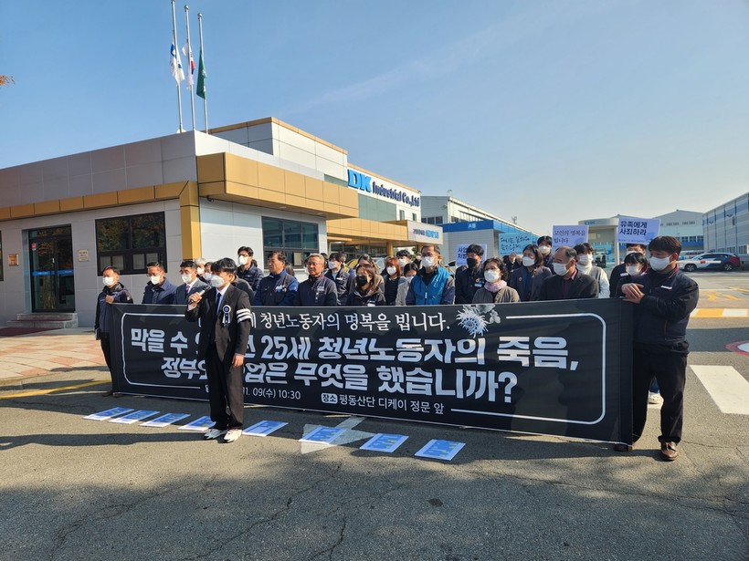 | ▲ 9일 민주노총 광주본부 등은 디케이 정문 앞에서 20대 청년 노동자가 숨진 사고에 대해 엄정한 수사와 재발 방지 대책 마련을 촉구했다. [사진=민주노총 광주본부] |