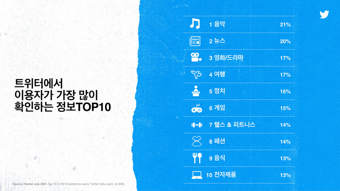 | ▲트위터에서 이용자가 가장 많이 확인하는 정보 TOP10, 1위는 음악 |