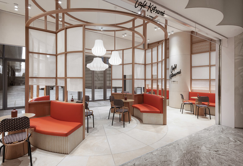 카페키츠네 현대백화점 목동점은 일본의 감성을 담은 섬세한 디자인으로 공간을 구성했고, 부드러운 모서리와 곡선형의 윤곽으로 따뜻하고 편안한 분위기를 연출한 것이 특징이다.
