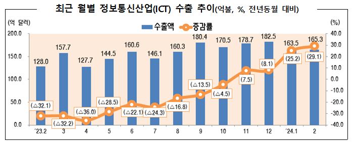 지난달 ICT 수출은 주력 수출 품목인 반도체의 4개월 연속 두 자릿수 증가와 디스플레이, 컴퓨터·주변기기 등 부분품 전반의 증가로 완연한 회복 양상을 기록하며 2개월 연속 두 자릿수 증가했다.