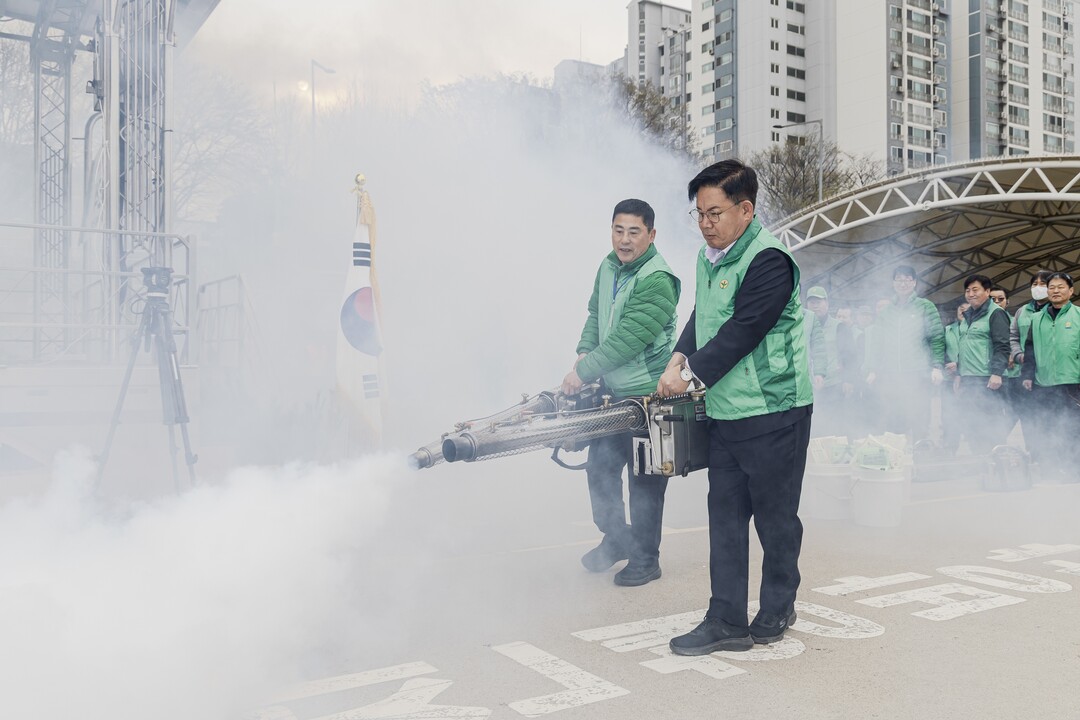 이후 박강수 마포구청장과 대원들은 직접 방역 장비를 시연하며 전염병 예방과 주민 안전을 위한 굳은 의지를 다졌다.