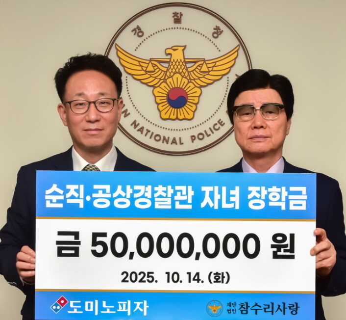 이번 순직공상 경찰관 자녀 장학금 전달식은 지난 14일 경찰청에서 김영훈 한국도미노피자 김대표이사와 경찰청 재단법인 ‘참수리 사랑’의 박노아 운영위원장 등이 참가한 가운데 진행했다. 이번에 전달된 5000만원의 장학금은 순직, 공상 경찰관들의 자녀들을 위해 사용될 예정이다.