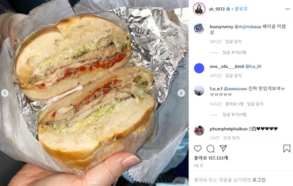 공개한 사진 속, 베이글을 한 입 가득 베어 문 설현의 모습이 담겼다. 이와 함께 속이 꽉 찬 여러 종류의 베이글을 공개해 침샘을 자극했다.