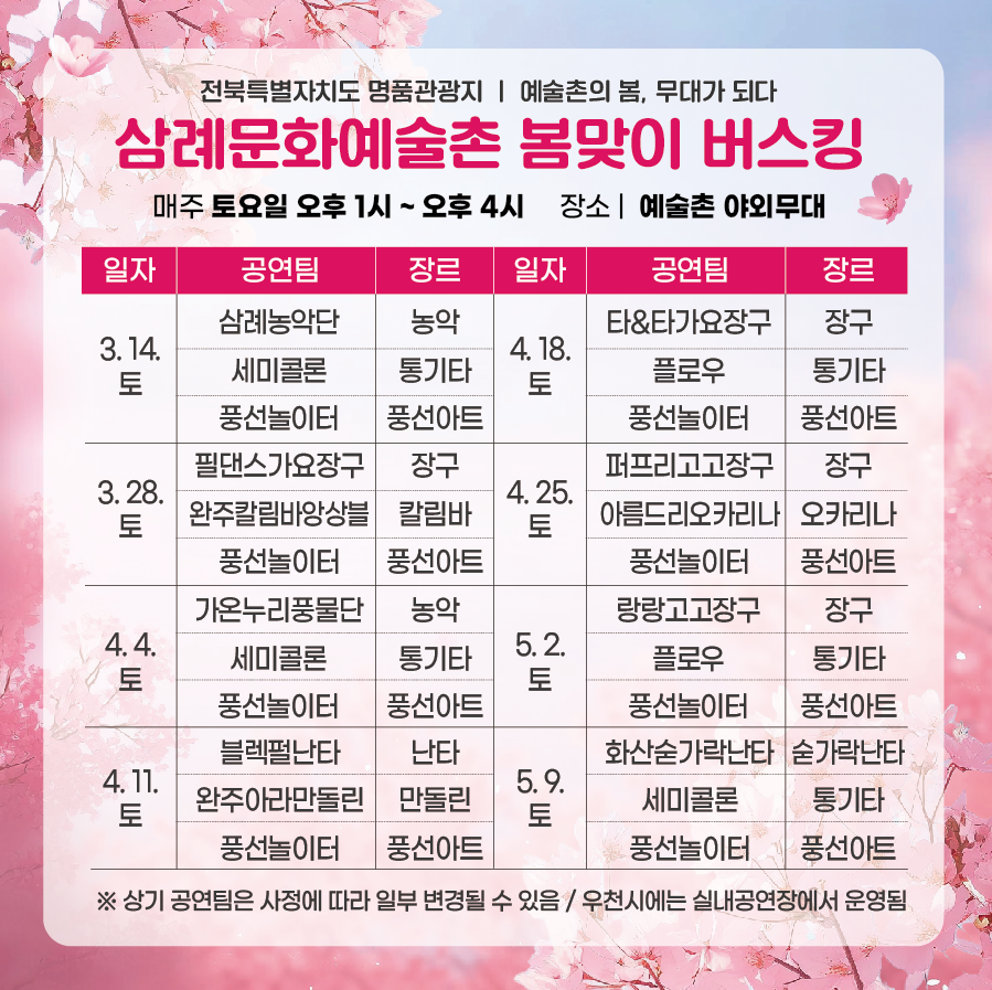 서진순 문화역사과장은 “삼례문화예술촌은 주민의 삶과 예술이 자연스럽게 어우러지는 완주의 대표적 문화 거점”이라며 “생동감 넘치는 버스킹을 통해 많은 분이 봄의 정취를 만끽하고 지역 예술인들의 열정에 따뜻한 격려를 보내주시길 바란다”고 말했다.