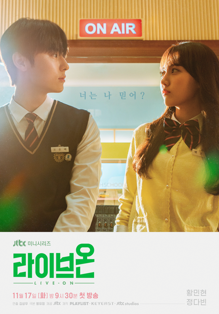 '라이브온'은 수상한 목적을 가지고 방송부에 들어간 서연고등학교 셀럽 백호랑(정다빈 분)이 엄격한 방송부장 고은택(황민현 분)을 만나 겪게 되는 상극 케미 로맨스 드라마다.