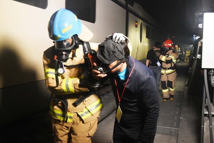 이번 훈련은 수서역에서 출발한 SRT 열차가 국내 최장 길이의 율현터널 5㎞ 지점 진입 중 방화범이 열차 내 통로에서 화재를 일으킨 상황을 가정해 이에 대한 대응 훈련이다.