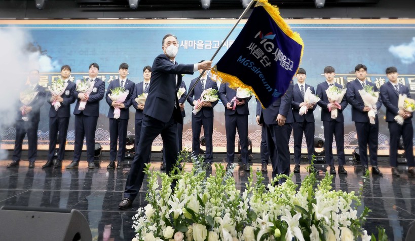 | ▲박차훈 새마을금고중앙회 회장이 10일 ‘MG새마을금고 씨름단 창단식’에서 ‘씨름단기’를 흔들며 선수단의 힘찬 출발을 알리고 있다. [사진=새마을금고중앙회] |