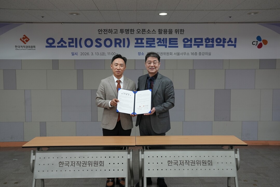 | 양종윤 CJ그룹 준법지원그룹장(왼쪽)과 강석원 한국저작권위원회 위원장이 13일 서울 용산구 한국저작권위원회 사무실에서 '오소리 프로젝트' 참여를 위한 업무협약을 체결했다. [사진=CJ그룹] |