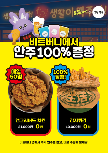감자튀김 쿠폰은 비트버니 앱 내 캐릭터 감자튀김을 클릭하면 즉시 발급되며, 1인당 최대 2매(1·2회차 각 1매)까지 참여 가능하다. 치킨 쿠폰은 이벤트 기간 동안 매일 50명을 추첨, 총 1000명에게 제공된다. 발급된 모든 쿠폰은 2025년 8월 31일까지 전국 생활맥주 매장에서 사용 가능하다.