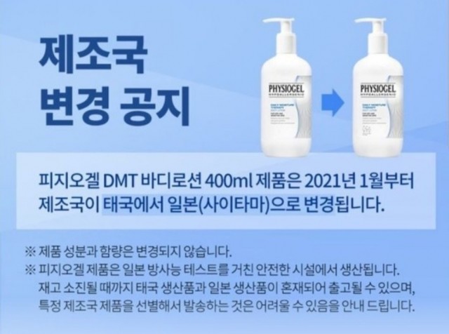 1일 LG생건에 따르면, ‘피지오겔 DMT 바디로션 400㎖’ 제품 제조국은 지난 1월 1일부터 태국에서 일본 사이타마로 변경됐다.