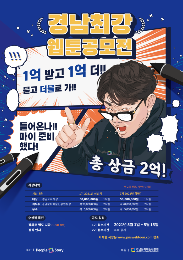 ㈜피플앤스토리는 지난 22일부터 '2021 경남최강웹툰공모전'을 진행 중이다. 이번 공모전은 웹툰 문화 거점 도시로 발돋움하기 위해 경남문화예술진흥원이 후원하고 경남 유일 웹툰 매니지먼트사인 (주)피플앤스토리 가 주관하여 차기 웹툰 스타 작가 발굴에 나선다.