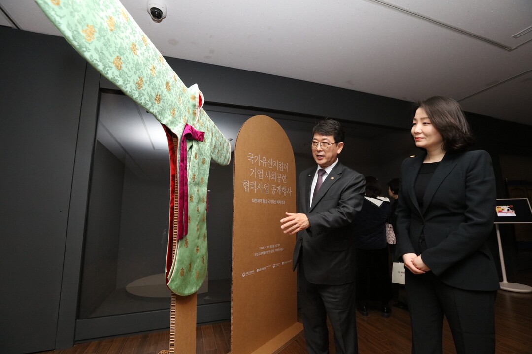 | 최응천 국가유산청장(왼쪽)과 이홍주 LG생활건강 상무가 영친왕비가 입었던 소례복(당의) 복제품을 살펴보고 있다. [사진=LG생활건강] |