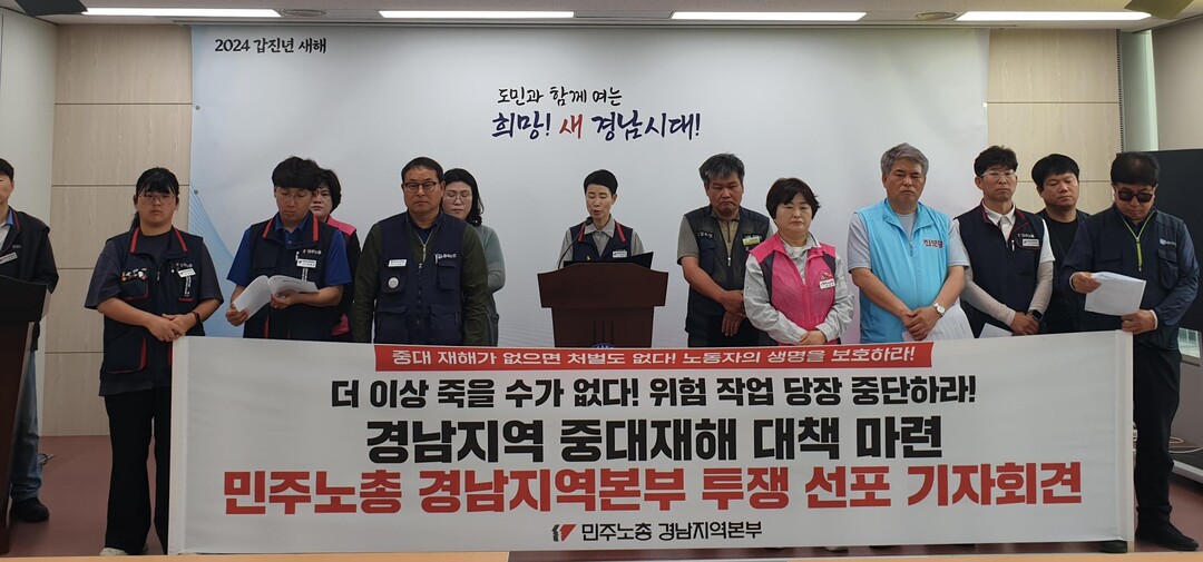 민주노총 경남본부는 14일 오전 도청 프레스센터에서 기자회견을 열어 “참담한 심정으로 이 자리에 섰다”며 “중대재해 근절을 요구하는 지역 사회의 목소리를 관계 당국이 외면하는 현실에서 노동자들이 할 수 있는 선택은 투쟁이다”라고 정부를 압박했다.