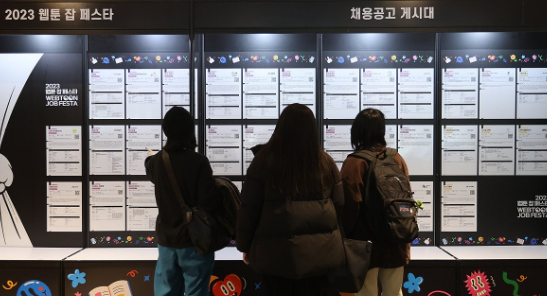 | 지난해 11월 28일 서울 강남구 삼성동 코엑스에서 열린 2023 웹툰 잡 페스타에서 구직자들이 채용정보를 살펴보고 있는 모습. [사진=연합뉴스] |