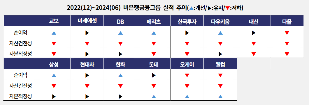 보고서에 따르면, 모든 비은행금융그룹은 지난 2022년 12월부터 자산건전성은 크게 저하됐고, 자본적정성은 비교적 안정적이나 자본완충력 제고가 필요한 계열사가 늘어났다.