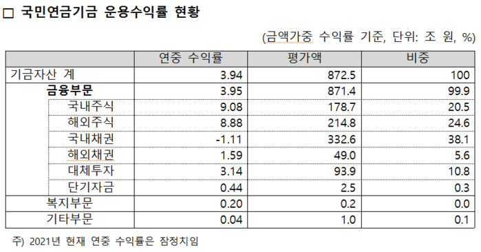 또 1988년 국민연금기금 설치 이후부터 2021년 3월 말 현재까지의 누적 운용수익금은 472조3000억원(잠정)으로 집계됐다.