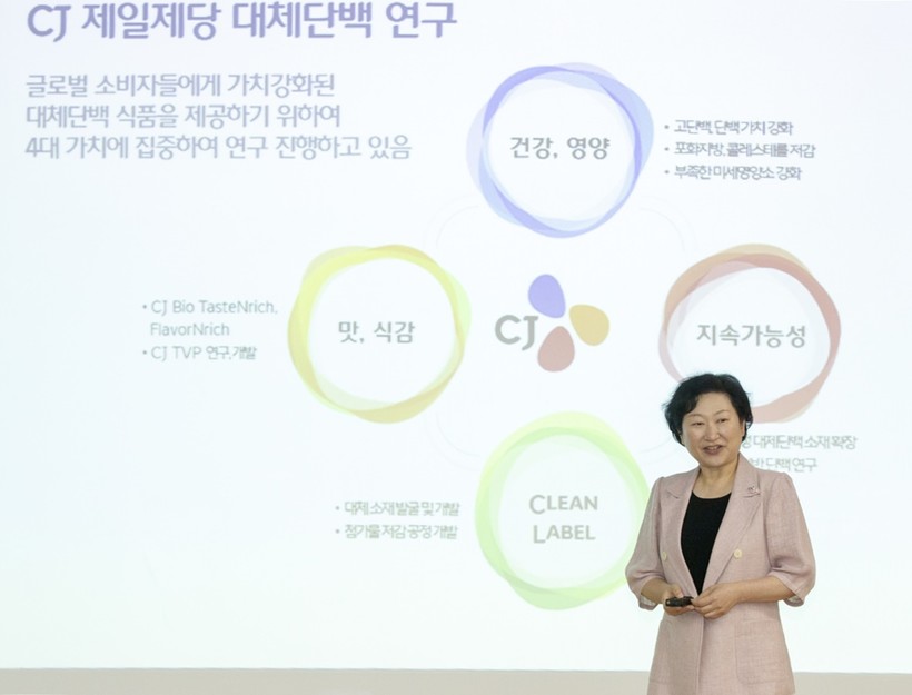 | ▲ 18일 서울 중구 CJ인재원에서 열린 Plant-based 사업 기자간담회에서 CJ제일제당 식품연구소 Science&Technology 담당 윤효정 상무가 미래 식량자원 연구 관련 내용을 발표하고 있다. [사진=CJ제일제당] |