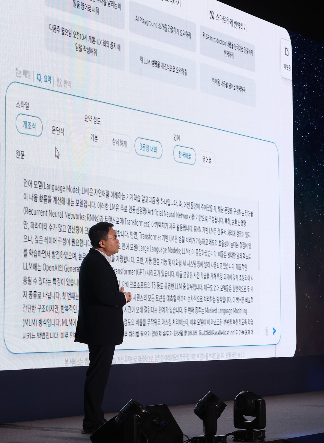 | 14일 삼성전자 서초사옥에서 열린 ‘삼성 개발자 콘퍼런스 코리아 2023’에서 이주형 상무가 ‘삼성 가우스’에 대해 설명하고 있다. [사진=연합뉴스] |