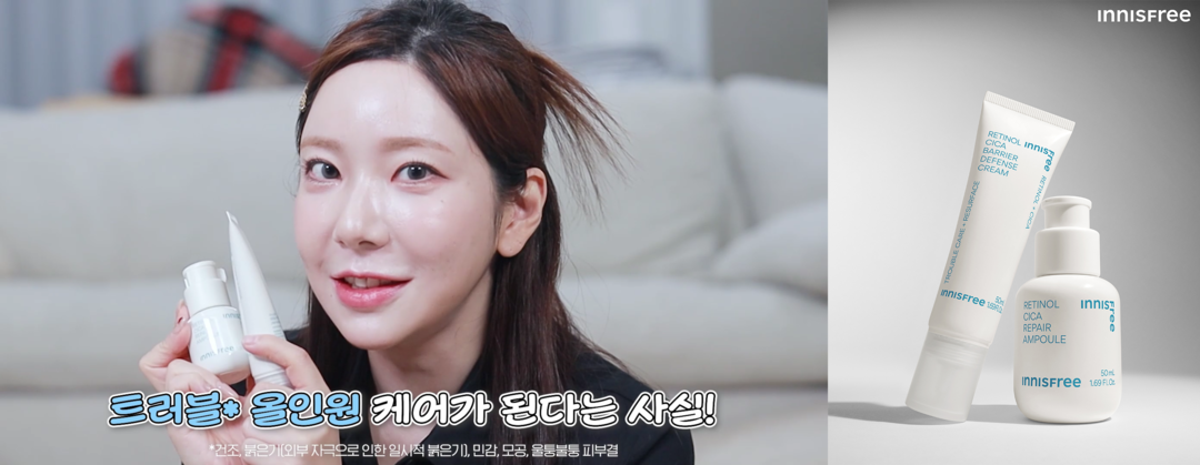 | 이니스프리는 뷰티 유튜버 깡나와 함께 공동 개발한 ‘레티놀 시카 흔적 장벽 크림’을 출시했다. [사진=이니스프리] |