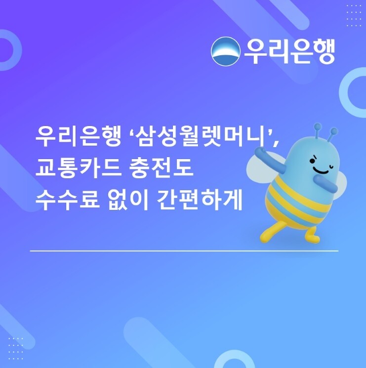 [HBN뉴스 = 이필선 기자] 우리은행은 '삼성월렛머니'에 모바일 교통카드 충전 기능을 도입한다고 27일 밝혔다.