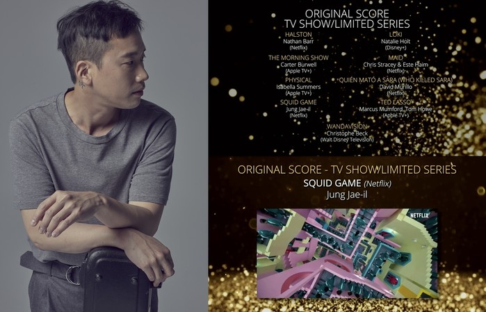 후보에는 넷플릭스 '오징어 게임'을 비롯해 넷플리스 '홀스턴', 디즈니 플러스'로키', 넷플릭스 '조용한 희망', 애플TV '피지컬', 애플TV '테드 래소', 디즈니 플러스 '완다비전'이 후보에 올라 쟁쟁한 경쟁을 펼쳤고, 수상자 발표의 순간 한국인 최초로 정재일 음악감독이 호명됐다. 작년에는 같은 부문에 넷플릭스 '퀸즈겜빗' 카를로스 라파엘 리베라가 수상한 바 있다.