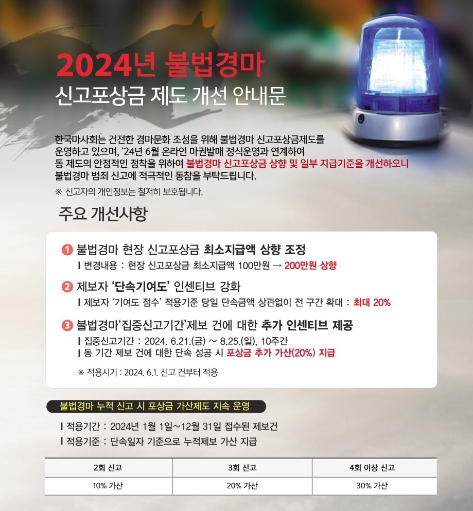 불법경마 신고포상금제도의 주요 개선사항으로는 ▲불법경마 현장 신고포상금 최소지급액 기존 100만원→200만원으로 상향 ▲제보자 ‘단속기여도’ 인센티브, 단속액수 상관없이 전체로 확대 ▲불법경마 ‘집중신고기간’ 제보 건 단속 성공 시 추가 인센티브 20% 가산지급이 골자다.