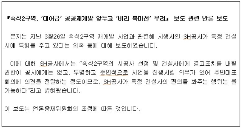 SH공사의 편파 행정 의혹은 비단 이뿐 아니다. 흑석2구역 시공사 선정 입찰을 준비하고 있는 GS건설이나 대우건설 등에 경고 공문을 남발하고 있다는 주장도 제기됐다.