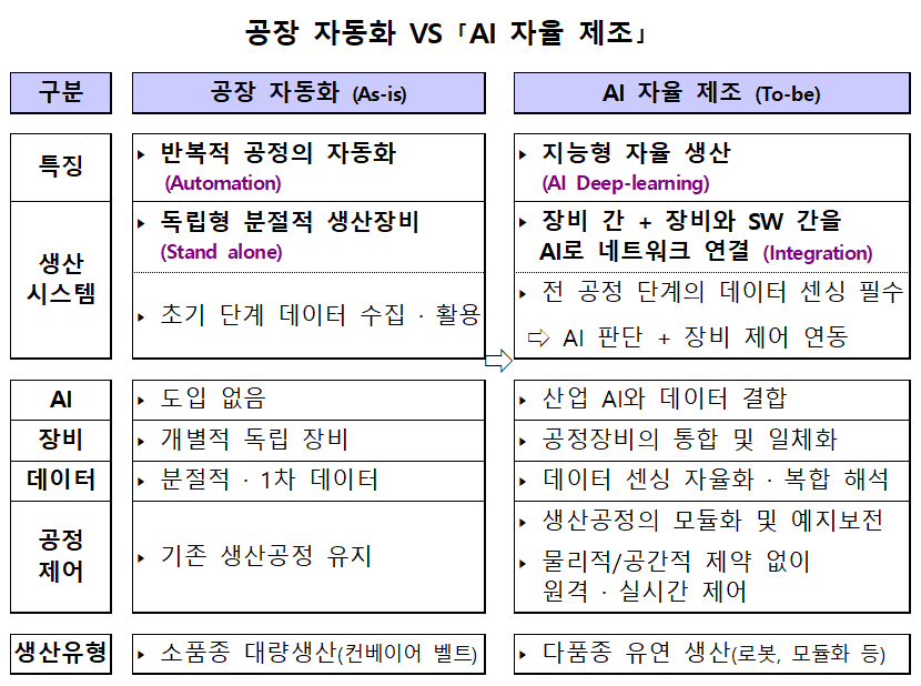 | 공장 자동화와 AI 자율 제조 비교. [자료=산업통상자원부] |