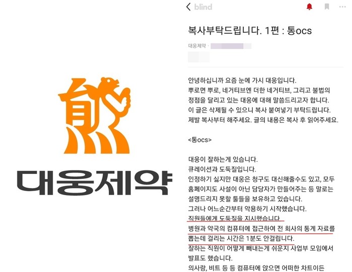 최근 직장인 익명 커뮤니티 어플리케이션 ‘블라인드’에는 현직 대웅제약 영업사원이 올린 글이 논란이 되고 있다