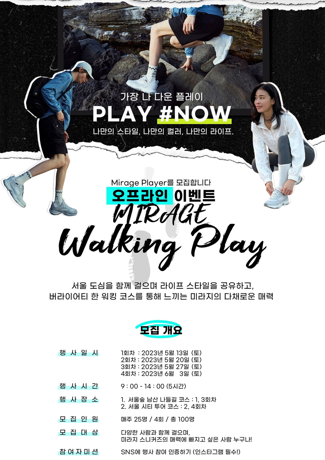 총 4회차로 구성된 이번 오프라인 체험단은 미라지 스니커즈를 착용하고 서울 도심을 걷는 이벤트 형태로 진행된다. 신청자는 참가 희망 회차를 선택할 수 있고, 1·3회차는 남산 나들길 코스(약 120분 소요), 2·4회차는 덕수궁·경희궁을 지나는 서울 시티투어 코스(약 180분 소요)에서 진행된다. 모집 인원은 회차별 25명씩 총 100명이다.