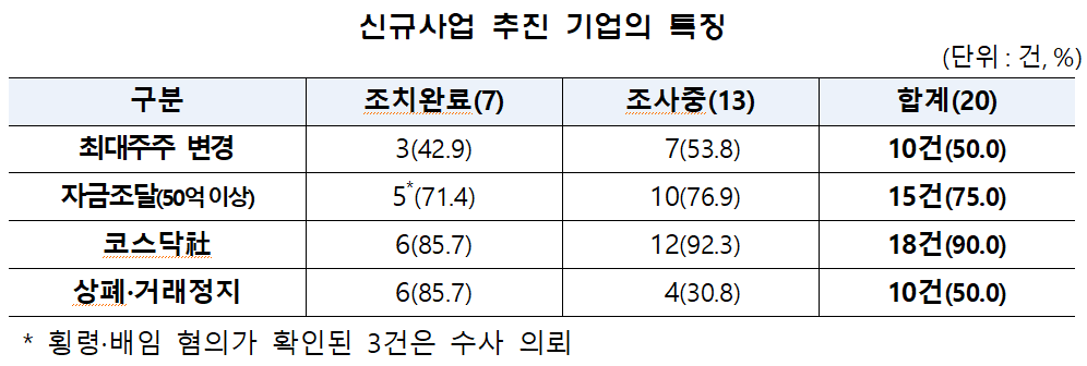 신규사업 가장 불공정거래 행위 과정에서 횡령·배임 혐의가 함께 발생되는 경우도 많았다. 조치완료 7건 가운데 3건(42.9%)의 조사과정에서 횡령·배임 혐의가 확인됐고, 이 가운데 1건은 일반투자자를 대상으로 수 백억원대의 유상증자를 실시했다.