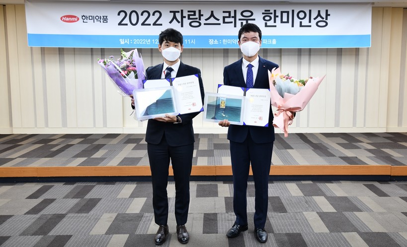 한미약품은 지난 16일 서울 방이동 한미약품 본사에서 열린 ‘제3회 자랑스러운 한미인상’ 시상식에서 김 팀장과 엄 파트리더에게 상패와 골드바를 수여했다고 19일 밝혔다.