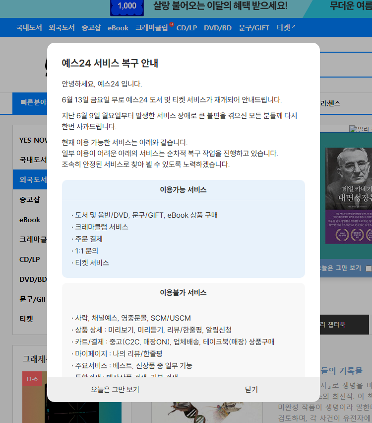 예스24의 초기 대응은 한마디로 '총체적 부실'이다. 회사는 해킹 당일인 9일부터 이틀간 홈페이지에 '시스템 점검 중'이라는 거짓 안내만 띄웠다. 실제로는 오후 1시에 한국인터넷진흥원(KISA)에 랜섬웨어 공격 사실을 신고했다.