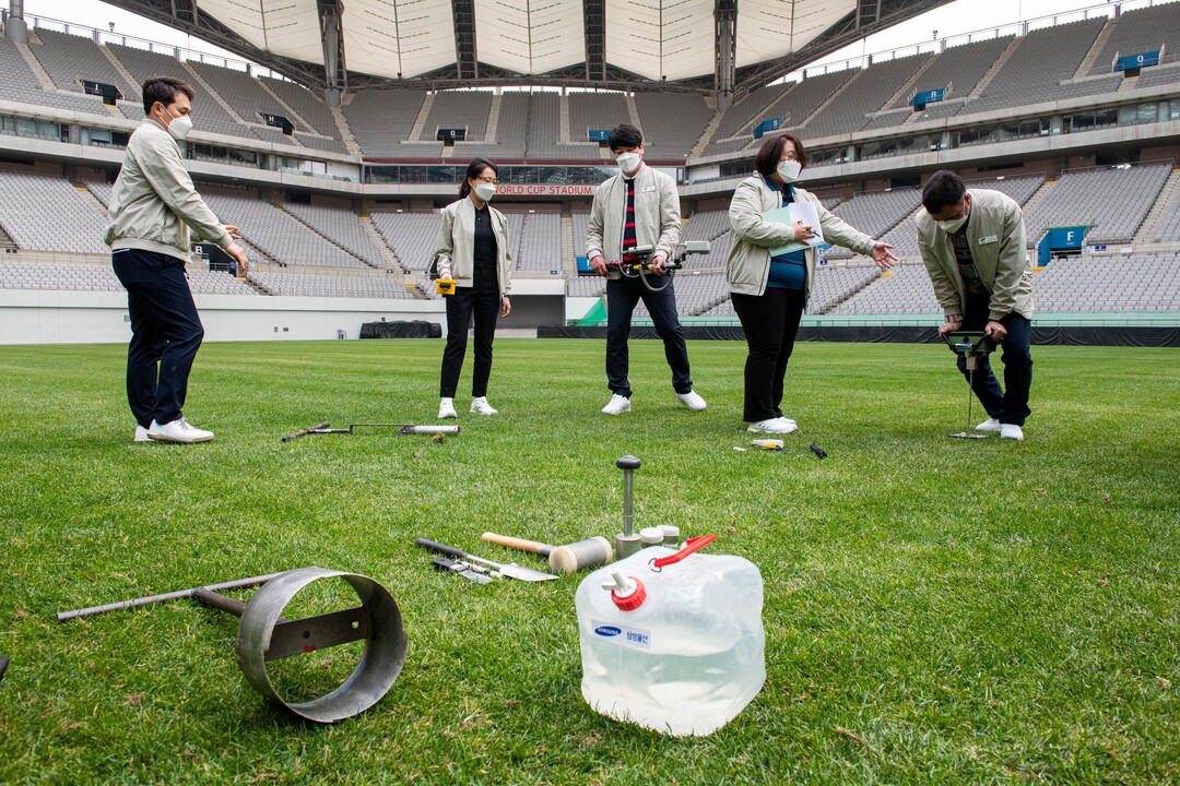 | 삼성물산 잔디환경연구소가 K리그 축구장의 잔디 생육 상태를 점검하고 있다. [사진=삼성물산 리조트 부문] |