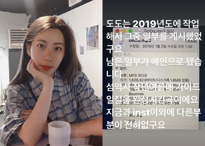 우지윤은 19일 자신의 인스타그램 인스타스토리에 "'도도'는 2019년 작업해 그중 일부를 SNS에 게시했고 남은 일부가 메인으로 됐다. '섬' 역시 작년 여름 가이드 1절을 완성한 곡으로 지금과 인스트 외에 다른 부분이 전혀 없다"고 밝혔다.