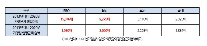 2013년 대비 2020년 가맹본사 매출액을 비교보면 bhc(4.843배), 교촌(2.503배), 굽네(2.471배), BBQ(1.826배) 순이다. 반면 2013년 대비 2020년의 가맹본사 영업이익을 비교했을 때는 BBQ(15.076배), bhc(9.275배), 교촌(3.110배), 굽네(2.925배) 순이었다.