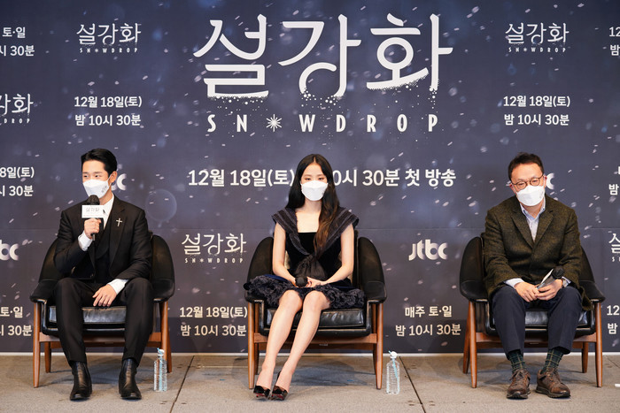 이날 조현탁 감독은 '설강화' 기획의도에 대해 "집필을 해준 유현미 작가님이 오랫동안 해온 기획이다. 2008년도에 정치범 수용소에서 탈북한 수기를 보고 우여곡절과 과정을 겪으면서 이야기를 확장해 나갔다. 여대 기숙사에서 실제 경험을 갖고 계신다. 그런 것이 합쳐지면서 '설강화' 구체화가 됐다. 탈북자의 수기로부터 출발해서 북한에 대한 언급이 들어있다. 북한이나 정치에 포커싱이 아니라 한 인간의 이야기를 하려고 하셨다"고 설명했다.