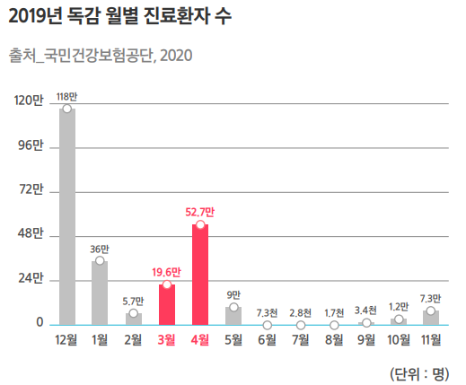 | ▲삼성화재가 환절기를 맞아 빈발하는 감기나 독감 등 계절성 호흡기질환에 대비해 보장성을 강화한 담보 특약을 제안했다. 국민건강보험공단에서 2020년 발표한 ‘2019년 독감 월별 진료환자’ 통계자료 [자료=삼성화재, 국민검강보험공단] |