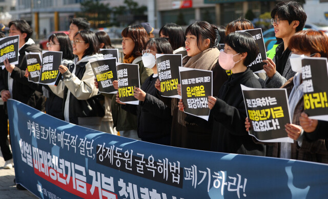 | 지난 16일 오후 서울 용산 대통령실 앞에서 '2015 한일합의 파기를 위한 대학생 공동행동' 관계자들이 일제 강제징용 피해배상 문제와 관련해 양국 재계가 조성하기로 한 '미래청년기금' 거부 청년학생 입장 발표 기자회견을 하고 있다. [사진=연합뉴스] |