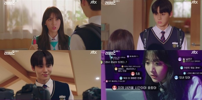 ‘라이브온’은 백호랑의 라이브 방송 중 ‘백호랑의 실체를 알려드립니다’라는 누군가의 폭로로 시작되면서 한 달 전 시점으로 돌아간다. 교내 점심 방송의 사연으로 존재를 처음 드러낸 익명의 저격수는 2년 전 엔젤 노래방에서 했던 생일파티를 기억하냐며 백호랑의 조용한 일상을 뒤흔들었다.