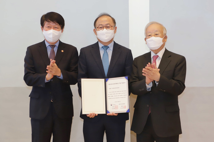 | ▲ 지난 16일 KT&G상상플래닛에서 열린 ‘청년고용 응원 컨퍼런스’에서 이상학 KT&G 지속경영본부장(부사장, 가운데)이 안경덕 고용노동부 장관(왼쪽), 손경식 한국경영자총협회 회장(오른쪽)에게 멤버십 가입증서를 받고 기념촬영을 하는 모습. [사진=KT&G] |