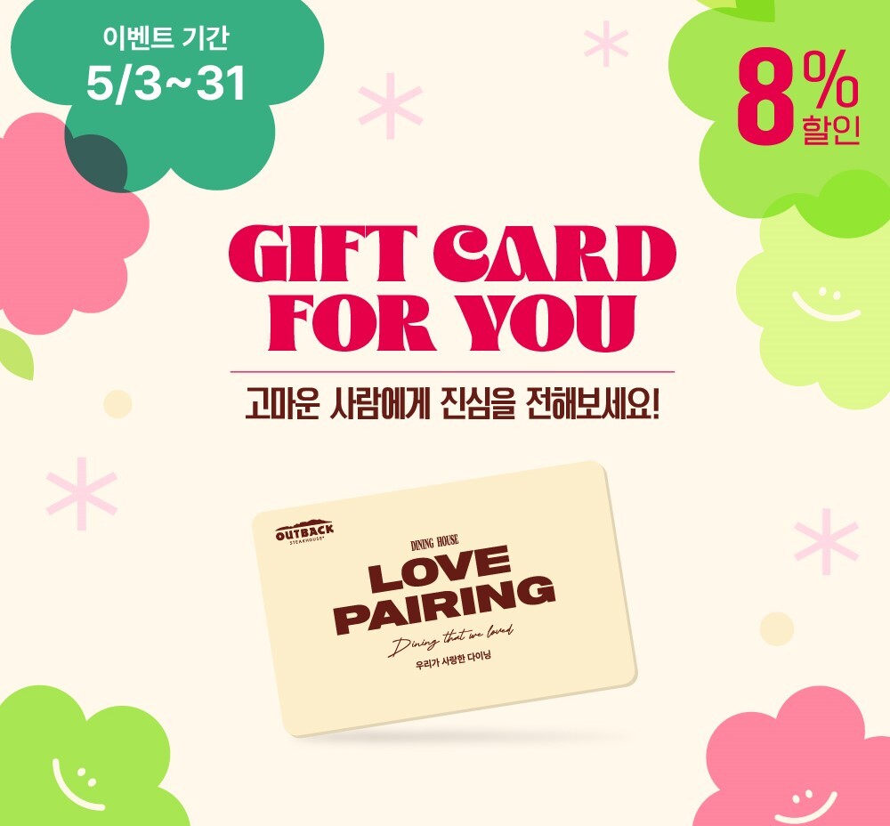 아웃백은 행사기간 동안 자사 통합 앱에서 ‘기프트카드 10만 원권’을 구매하거나 선물하기를 이용하는 고객에게 8%의 할인 혜택을 제공한다. 기프트카드는 아이디당 최대 5장까지 구매할 수 있다.