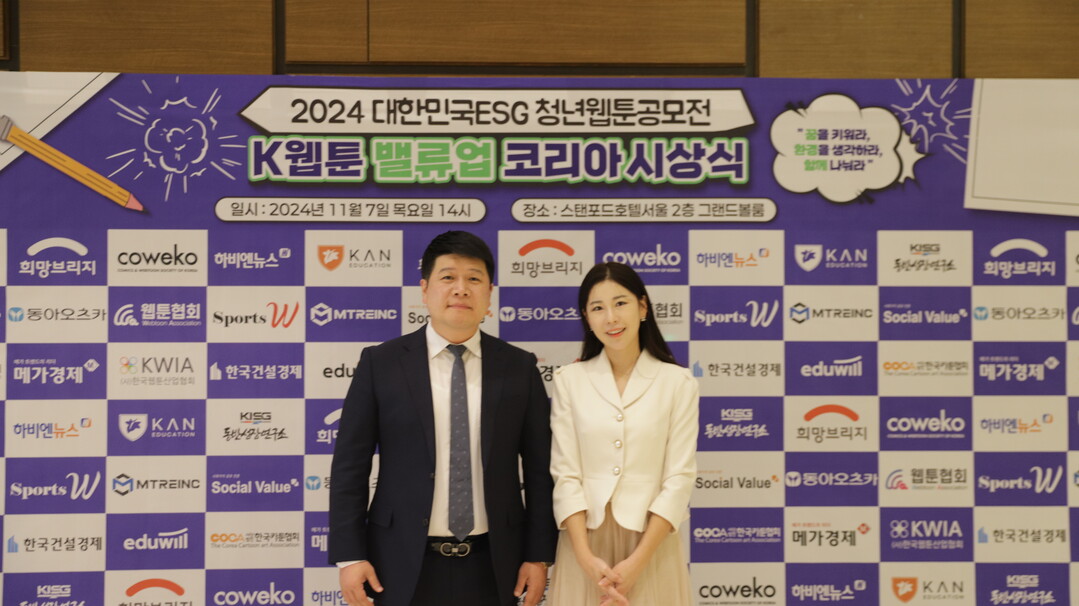 | 7일 오후 2시 서울 상암 스탠포드호텔에서 열린 ‘제1회 2024 대한민국 ESG 청년웹툰 공모전’ 시상식에서 김종열 메가경제신문 대표(왼쪽)와 김우림 아나운서가 기념촬영을 하고 있다. |