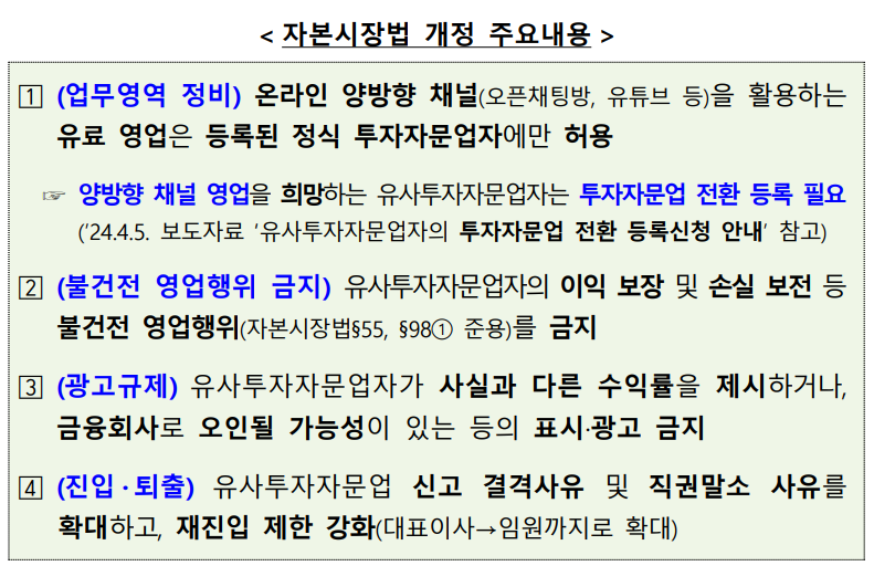 오픈채팅방과 유튜브 등 온라인 양방향 채널을 활용해 고객과 투자 관련 의견을 교환하는 유료 영업은 등록된 정식 투자자문업자만 허용된다.