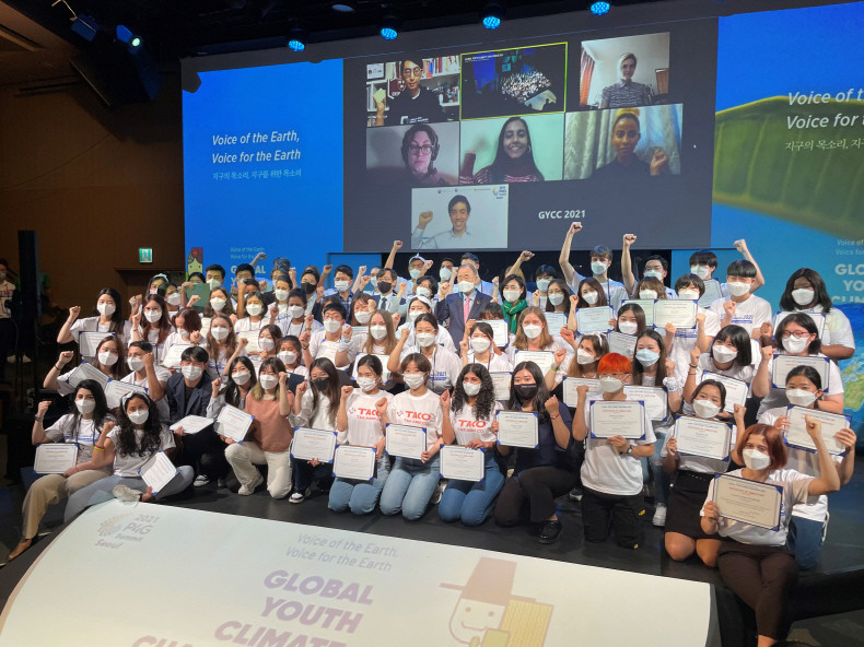 | ▲ 글로벌에코리더 참여 학생들이 ‘2021 피포지(P4G) 서울 녹색미래 정상회의’ 공식 사전행사에서 기념사진을 찍고 있다. [사진=LG생활건강] |